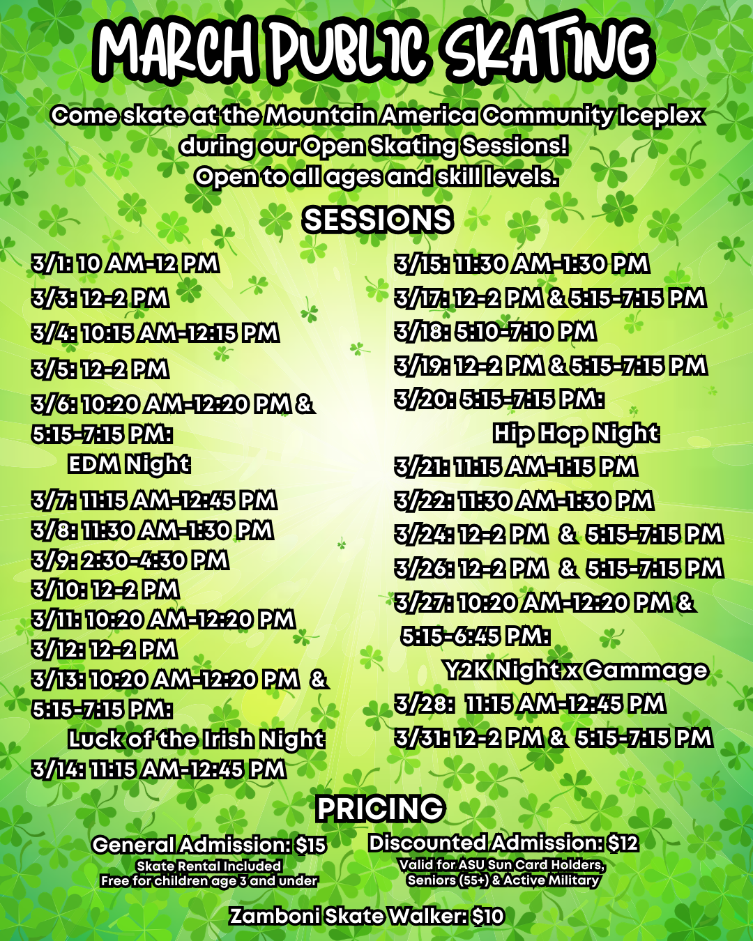 Join us at the Mountain America Community Iceplex for Public Open Skating! Whether you’re a beginner on the ice or advanced, young or old, solo or families, Public Skating is perfect for everyone.